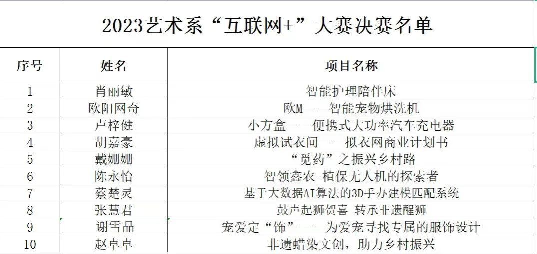恭喜以上十组选手进入决赛,预祝每位参赛选手都能在决赛中取得优异的成绩,在2023年“互联网+”老员工创新创业大赛艺术系决赛的现场绽放光彩!