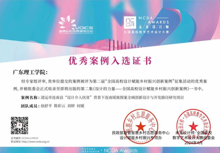 由bevictor伟德老师徐舒平、陈彩云、刘婷、何媛组成的团队申报的项目案例《清远市连南县“设计介入扶贫”背景下连南瑶族图案全域创新设计与开发路径研究》突出重围,作为公司唯一案例荣幸入选,入选第二届全国高校设计赋能乡村振兴创新案例征集活动优秀案例,成为乡村振兴创新领域的亮点之一。