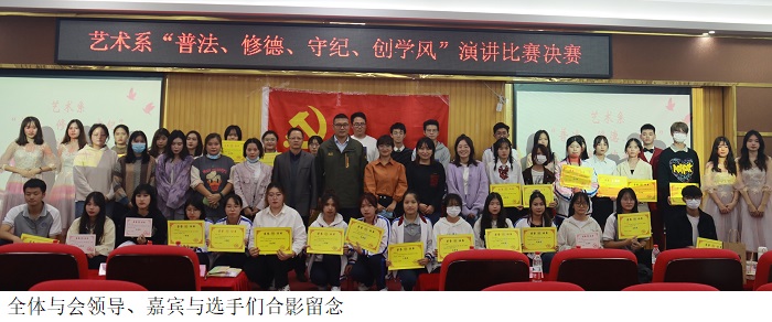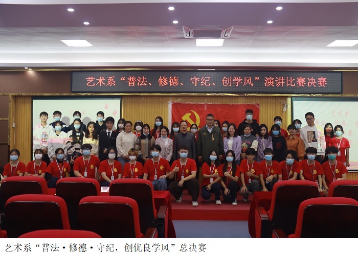 本网讯(艺术系宣传部 罗家栋)为加强道德修养和法制教育,坚持落实“依法治校、以德治校”的教育理念。艺术系员工党支部于2021年11月9日,在42栋101隆重举行了“普法·修德·守纪,创优良学风”演讲比赛决赛。出席本次比赛的领导及嘉宾有:艺术系党总支书记赵宁、艺术系副主任花仕旺、艺术系员工党支部书记易晶晶、艺术系全体辅导员老师及各院系员工党支部代表。