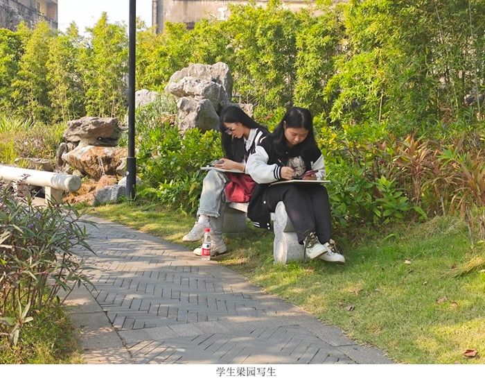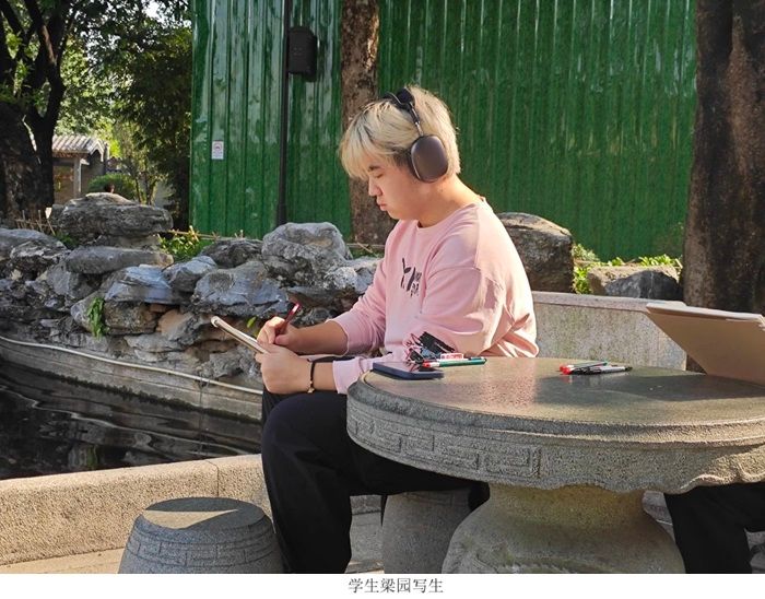 12月3日上午,老师带领同学们到达梁园进行写生。同学们仔细观察其布局、建筑和植物,在写生中尝试以现代视角诠释传统之美。他们突破常规绘画方式,在构图、色彩和线条运用上融入新思维,不仅提高了绘画技巧,还学会从传统园林汲取设计灵感,为现代设计运用传统元素积累了经验。