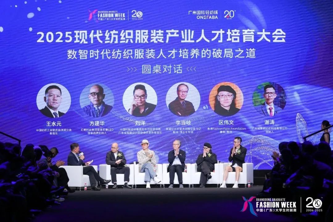 “数智时代纺织服装人才培养的破局之道”圆桌对话由中国纺织工业联合会流通分会副会长王水元担任主持,就“服装教育应如何培养出既懂技术又具创意的复合型人才、如何更好地对接湾区产业发展需求、数智时代如何让教育更好地关注到新型产业需求、设计师的核心竞争力是否发生变化、在数智化转型中企业最看重哪些能力”等话题展开讨论,原清华大学美术公司党委书记、教授、博士生导师李当岐,香港Fashion Farm Foundation 董事、教授区伟文,中国时装设计最高奖金顶奖、广东省服装设计师协会终身荣誉会长刘洋,汇美时尚集团董事长兼CEO、茵曼品牌创始人方建华,广州维斯尼纺织科技有限公司创始人谢涛等专家及企业代表分别贡献了真知灼见,金句频出、干货满满。