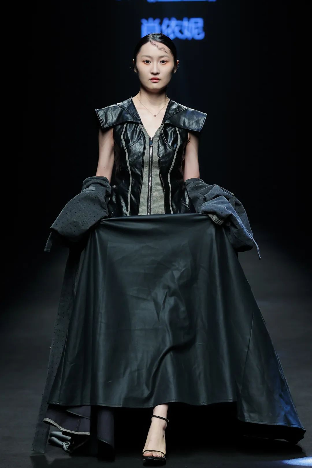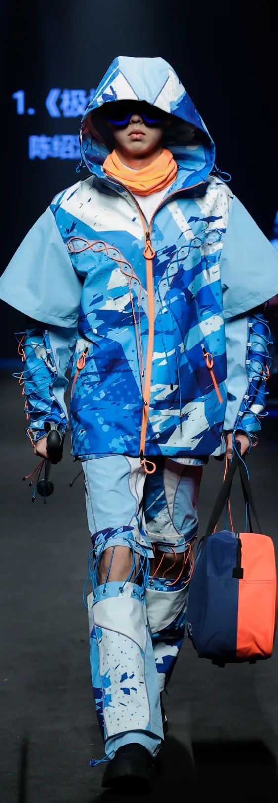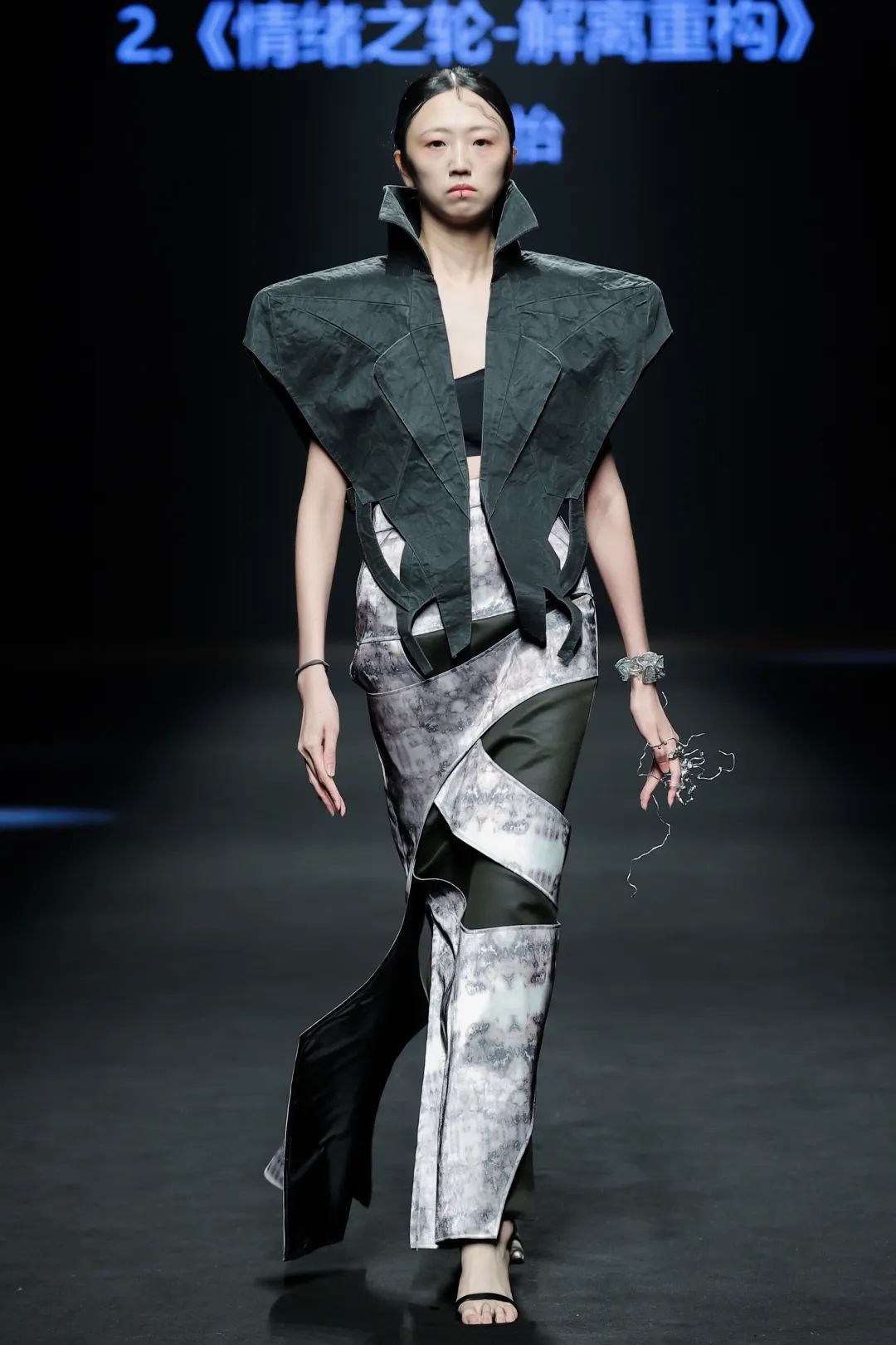 整场大秀分3个主题演绎:主题一《暗夜森灵》以赛博霓虹重塑空间拓扑,呈现未来衣橱的无限可能;主题二《数字涂鸦》以泼墨笔触勾勒立体数字,撞色拼接剪裁利落,街头潮感十足;主题三《国色新韵》则用古布与数字绣纹重构经典,在光影迷宫中展开一场跨越千年的对话。