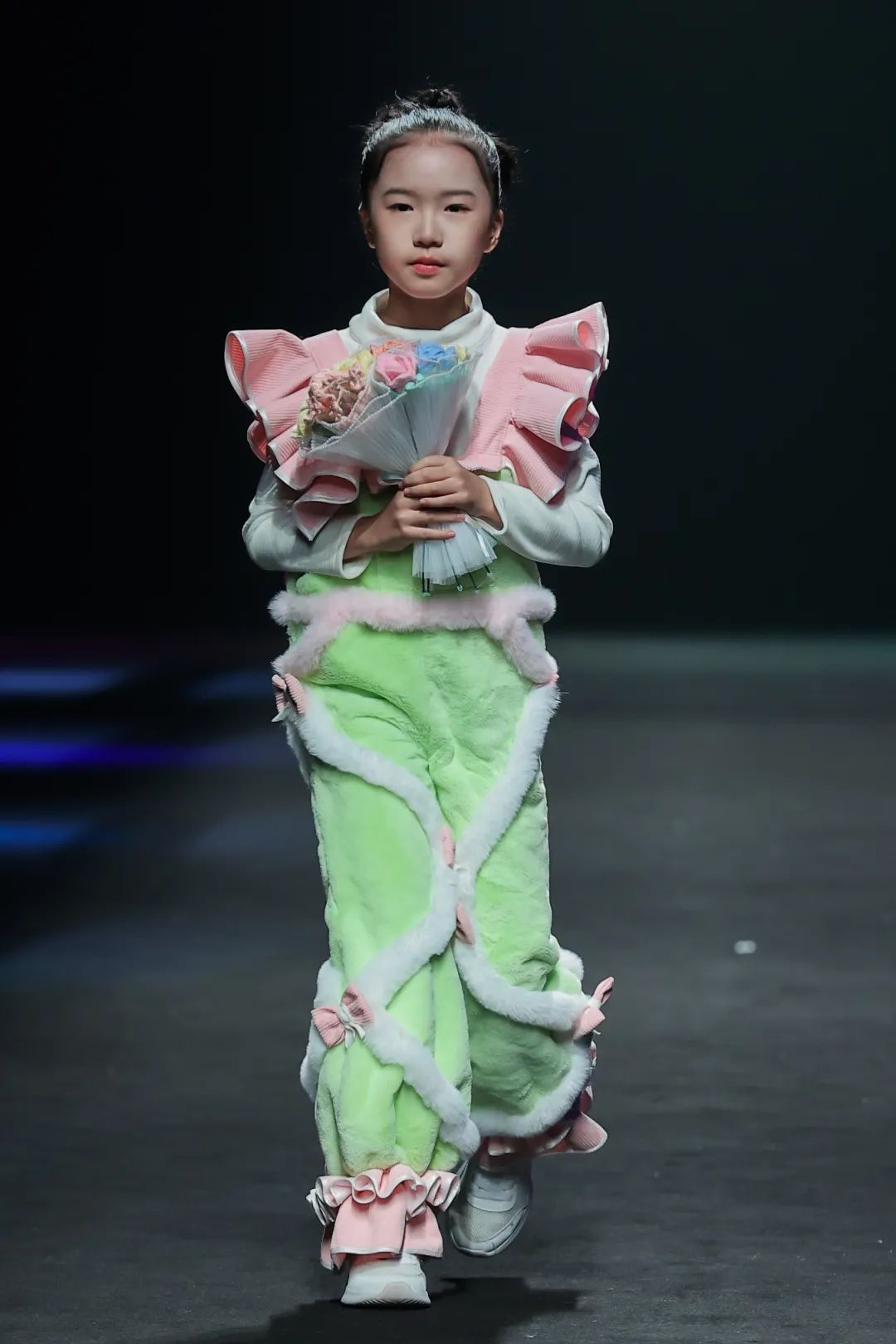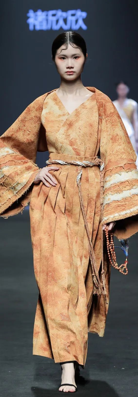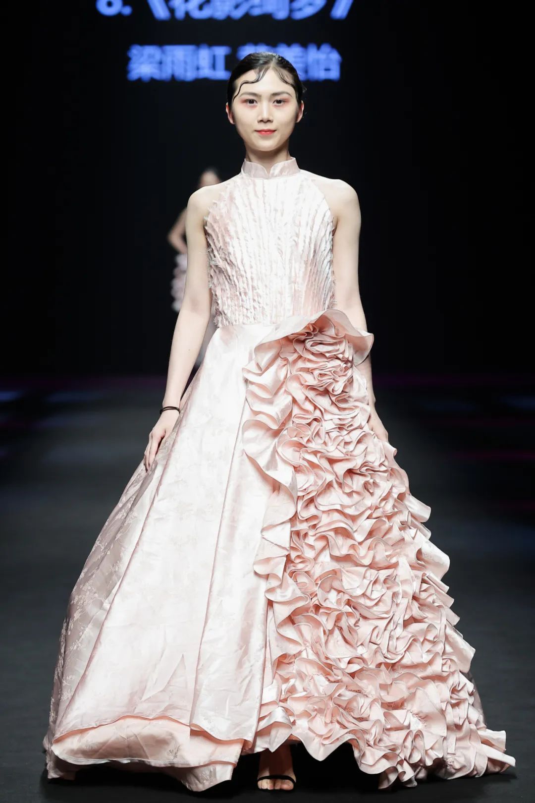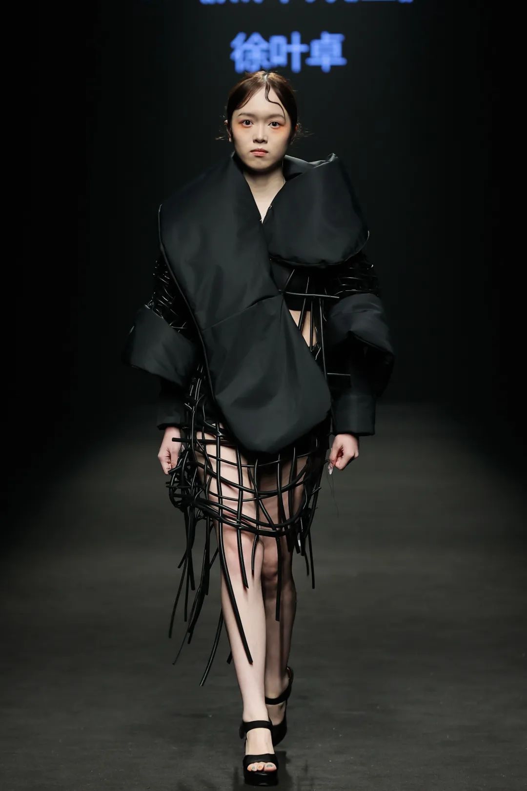 整场大秀分3个主题演绎:主题一《暗夜森灵》以赛博霓虹重塑空间拓扑,呈现未来衣橱的无限可能;主题二《数字涂鸦》以泼墨笔触勾勒立体数字,撞色拼接剪裁利落,街头潮感十足;主题三《国色新韵》则用古布与数字绣纹重构经典,在光影迷宫中展开一场跨越千年的对话。