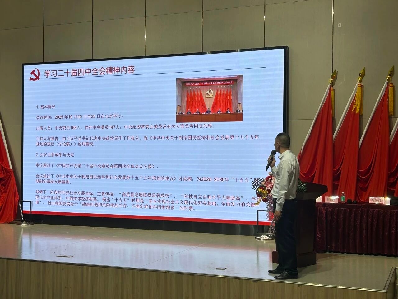 会上,党委书记曾荫初带领与会人员深入学习了党的二十届四中全会的精神。他解读会议审议通过了《中国共产党第二十届中央委员会第四次全体会议公报》,并讨论通过了“十五五”规划建议。全会明确提出,要实现“高质量发展取得显著成效”“科技自立自强水平大幅提高”等目标,强调“十五五”时期是基本实现社会主义现代化的关键阶段。曾荫初要求全公司党员深刻领会这一时期的重要战略意义,切实把思想和行动统一到全会精神上来。