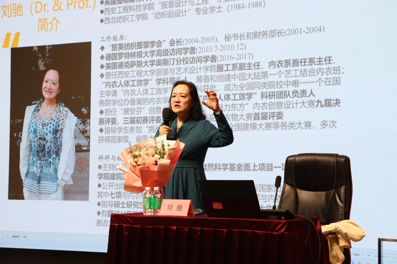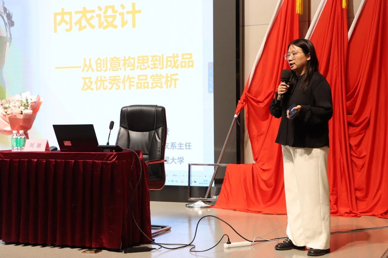 讲座开始,由李珂悦副经理率先致辞,欢迎刘驰教授的到来,并简要介绍其学术背景与研究成果。随后刘驰教授结合个人经历生动讲解了内衣设计从“实用”到“美用合一”的发展趋势,她强调,在现代补正内衣设计中,造型的科学性与美观性是决定产品品质的重要因素之一。接着,通过展示大量内衣纸样设计与人体结构原理的关联,揭示了如何通过精准的结构设计实现“以人为本”的舒适贴体与功能塑形。此外,她还详细介绍了纯棉、奥代尔、莱卡、蕾丝、定型纱等内衣材料的选择与应用,以及比例、平衡、反复、强调、协调等九大形式美法则在内衣设计中的具体运用。