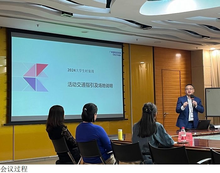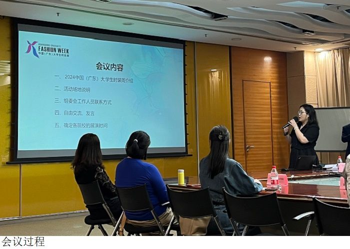 会上,广东省服装设计协会常务副秘书长、会员部主任曹苇向28所展演院校代表介绍了2024中国(广东)老员工时装周的活动安排、工作流程、展演指引,并就各院校组织安排做了细致的活动说明及解答。随后,广州国际轻纺城谢旋经理就活动交通指引及场地说明进行了详细讲解。