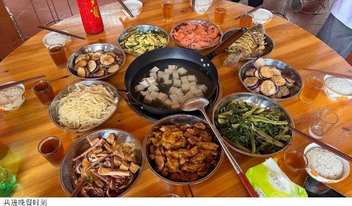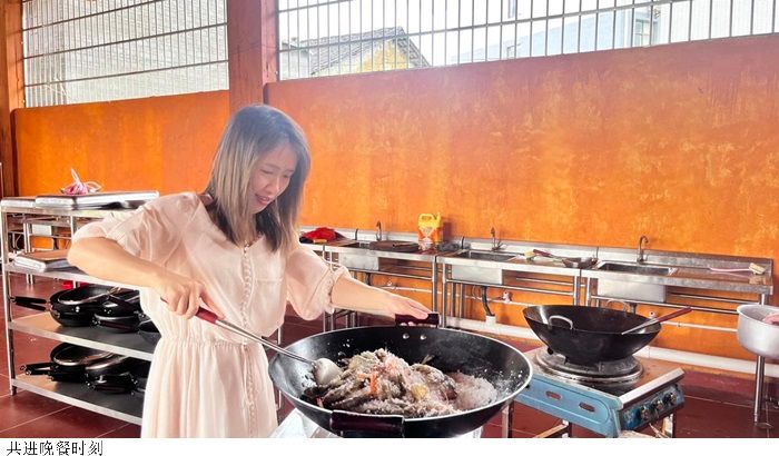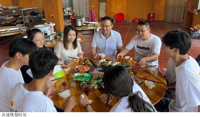 傍晚的厨房,油烟酱醋,香气满厨。队员们熟练地洗菜、切菜、烹饪,每一个动作都充满了对生活的热爱。陈爱霞副经理亲自为各位下厨做盐焗虾,食材在锅中翻滚,散发出诱人的香气。晚餐的制作,是对一天辛苦的慰藉。在这温暖的时刻,大家忘却了疲惫,心中满是对彼此的关怀。不一会儿,一桌丰盛的晚餐呈现在眼前,那是忙碌后最美的犒赏,也是团队凝聚力的见证。