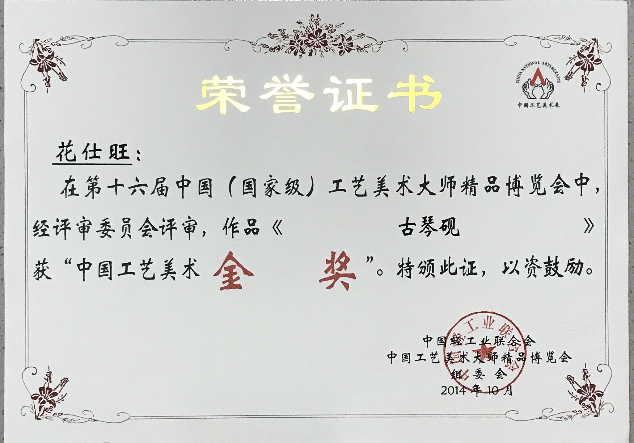 吴珊 2018年6月 中国工艺美术博览会“中艺杯”艺术品评比大赛银奖,国家级