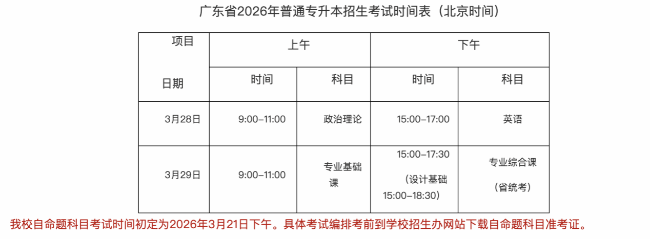 (四)普通专升本招生考试时间为2026年3月28日(星期六)至29日(星期日)两天,具体安排见下表: