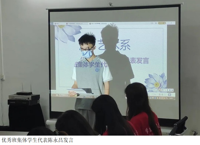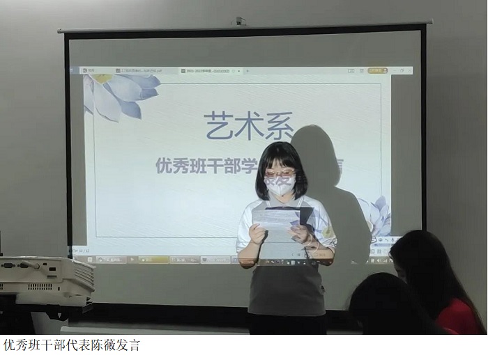 优秀班干部代表陈薇结合名人名言分享工作体会。她表示,萨特说过:“人生是一系列选择的过程。”既然选择了当一名班干部,就要学会为同学服务,纵使前进的道路上充满荆棘,我们也要披襟斩棘,无畏向前!