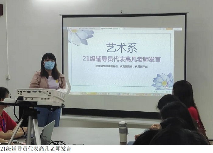 21级辅导员代表高凡老师在发言中说道,感谢21级艺术系员工助理班主任这一年的辛勤付出,不管是在迎新的时候还是开班会的时候都能看到各位辛勤付出的成果,是大家的努力让艺术系员工助理班主任这个大集体变得越来越好,希望大家能借此机会继续努力,突破自己!
