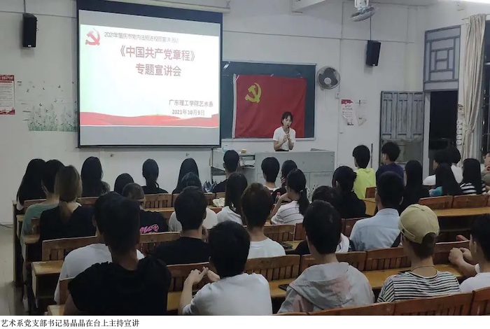 本校讯(宣传部:温梦甜)2021年10月9日晚上19时,艺术系于6栋404课室召开了《中国共产党章程》专题宣讲会,参会人员有艺术系员工党支部书记易晶晶老师、入党积极分子代表和艺术系全体党支部成员。