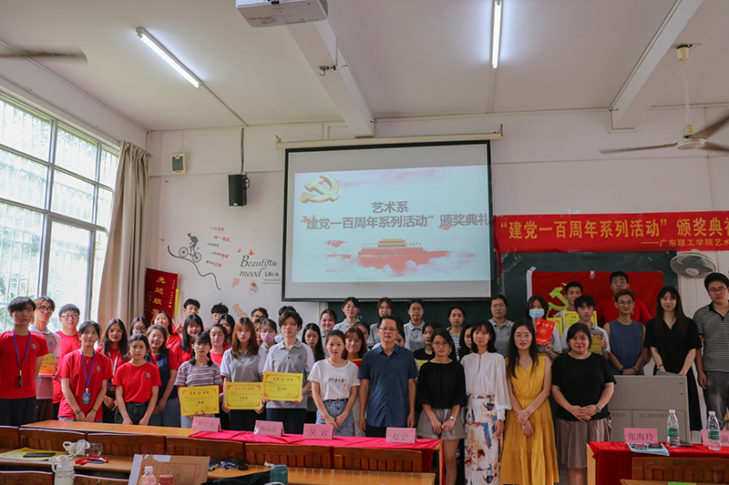 本网讯(艺术系党支部 陈芊莹) 艺术系于2021年5月13日中午12时40分,在6栋103课室举办“建党一百周年系列活动颁奖典礼”,本次活动参与人员有艺术系党总支赵宁书记、学工部长吴云老师、员工党支部书记易晶晶老师、分团委书记路正玉老师、奖助贷负责人张海玲老师、易班工作站负责人涂瀛老师、考证负责人龙媛老师、辅导员余丽嘉老师艺术系全体获奖员工以及艺术系员工党支部全体成员。