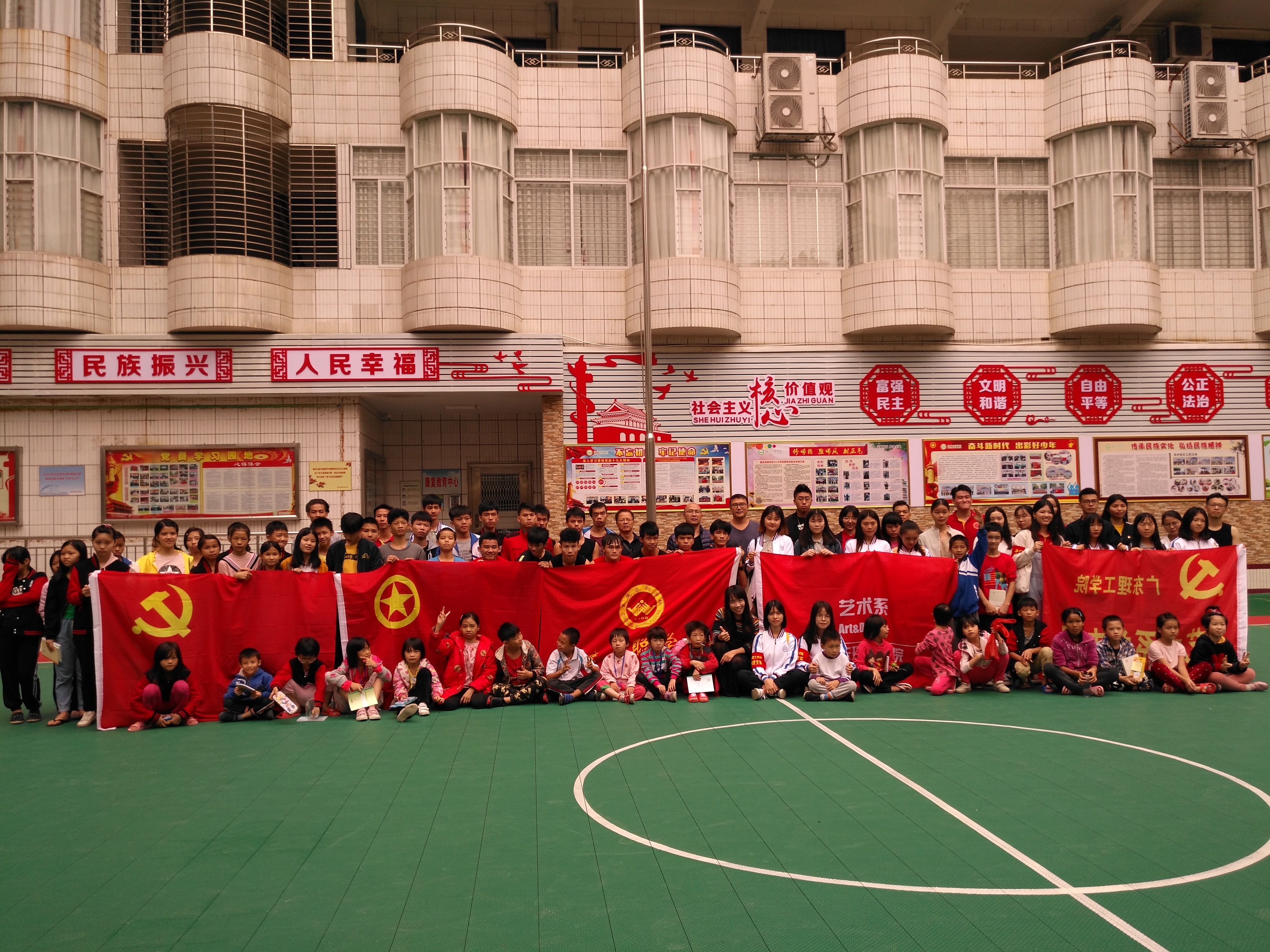 紧接着,进行了短暂的座谈。当座谈结束后,教工党员与启聪公司的员工进行了篮球联谊赛,艺术系党支部成员和员工党员与孩子们进行了夹玻璃球、剪圆游戏、吃饼干、学模特走路、找茬等小游戏。我系员工还帮助孩子们打扫教室卫生,与孩子们聊天,给启聪集团捐赠漫画书、文具等物品。
