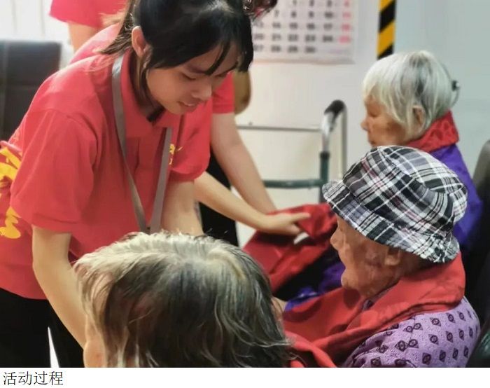 在养老院负责人的带领下,赵宁书记,易晶晶老师以及同学们带着诚挚和关爱之心为老人们分发着面包、牛奶等慰问品,还送去了大米、食用油、面粉等生活物资,期间赵宁书记详细了解了老人们的生活起居、健康状况和切实需求,倾听老人们的心声,并希望他们保重身体,积极面对生活。老人们热情欢迎大家的到来,同学们跟老人们谈心,并为老人们戴上红色围巾,把温暖和爱心送到了老人们的心坎上,让他们感受到青少年们的朝气和社会的温暖。随后,赵宁书记及参与此次活动的全体同学与老人们合影留恋。