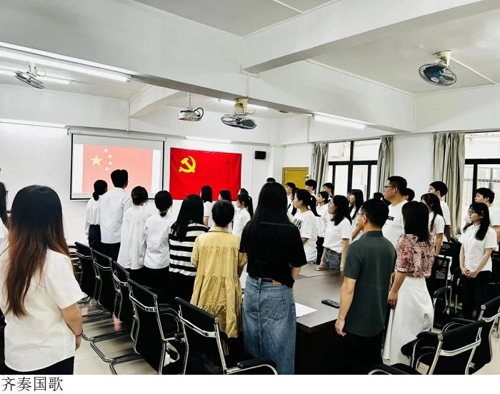 会议伊始,全体起立,奏唱国歌。