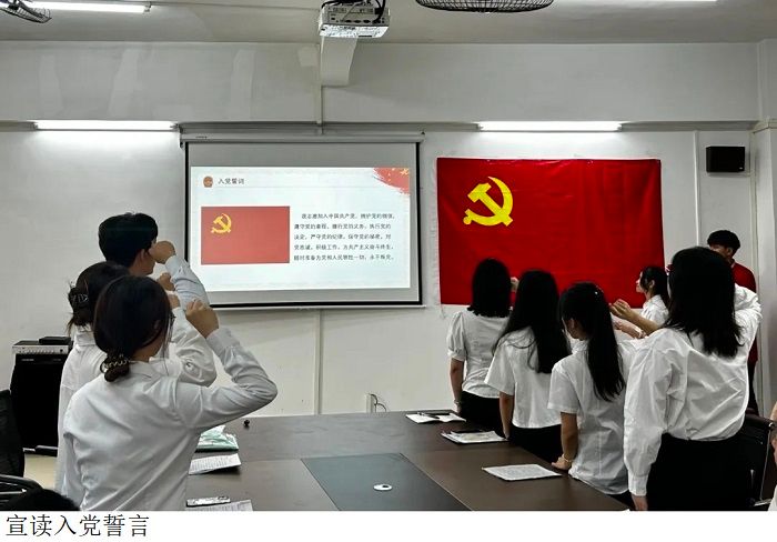 会议第五项:由本次转正的正式党员举起右拳面向党旗,宣读入党誓词。