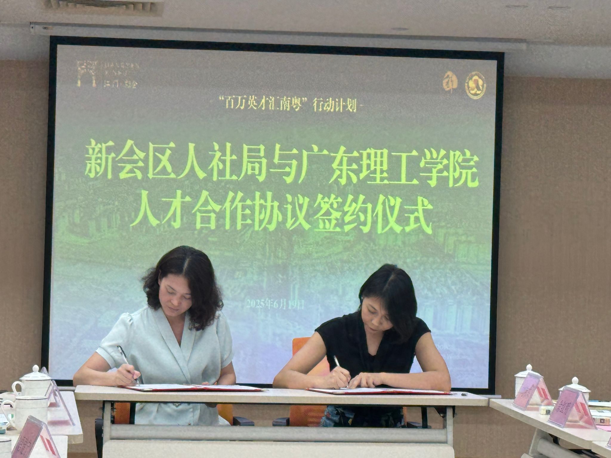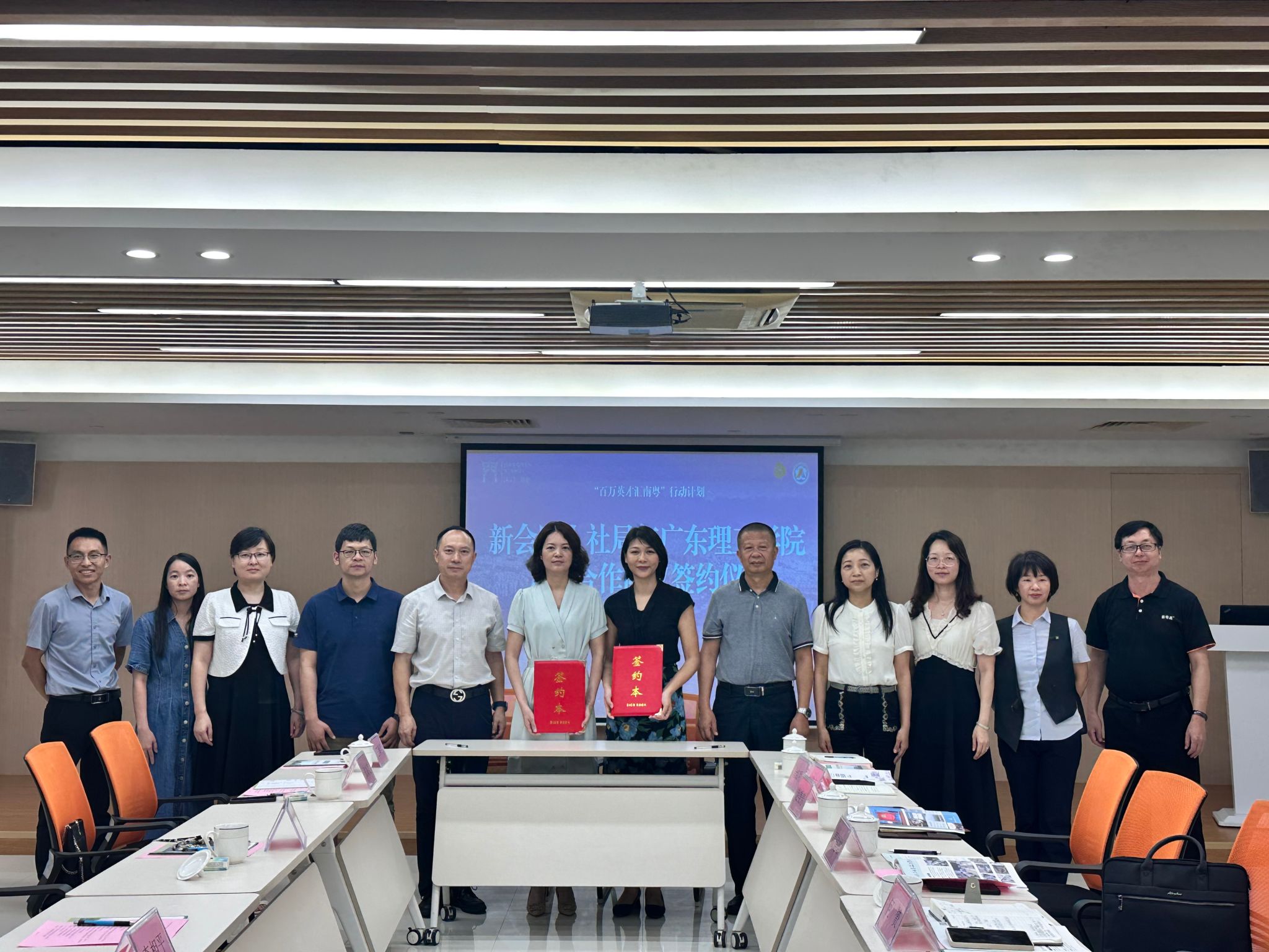 6月19日上午,唐建宁副董事长一行首先来到新会区人社局走访交流,在新会区人社局相关工作人员陪同下参观了展厅,深入了解新会区在人力资源开发、就业服务、社会保障等方面的工作成果。接着举行了“校政企”交流座谈会,会上,唐建宁副董事长一行与新会区人社局局长聂健雄、副局长何赟、社保局局长赵美芳、专技股股长余红明,智通人才连锁集团江门公司副总经理刘伟东、广东恒申美达新材料股份公司人事经理梁小雅、广东彩艳股份有限公司人事经理黄玉玲、江门市意奇高工贸有限公司人事经理李曙光等就人才引进政策与校地合作机制、产教融合平台建设、实习就业一体化、产教融合实践与技能提升、企业用人需求精准对接等方面进行了深入探讨,并达成了广泛共识。随后,在三方代表的共同见证下,唐建宁代表公司与新会区人社局签订人才合作战略协议,标志着双方在校企合作、人才培养与就业服务等领域合作迈出坚实的一步。