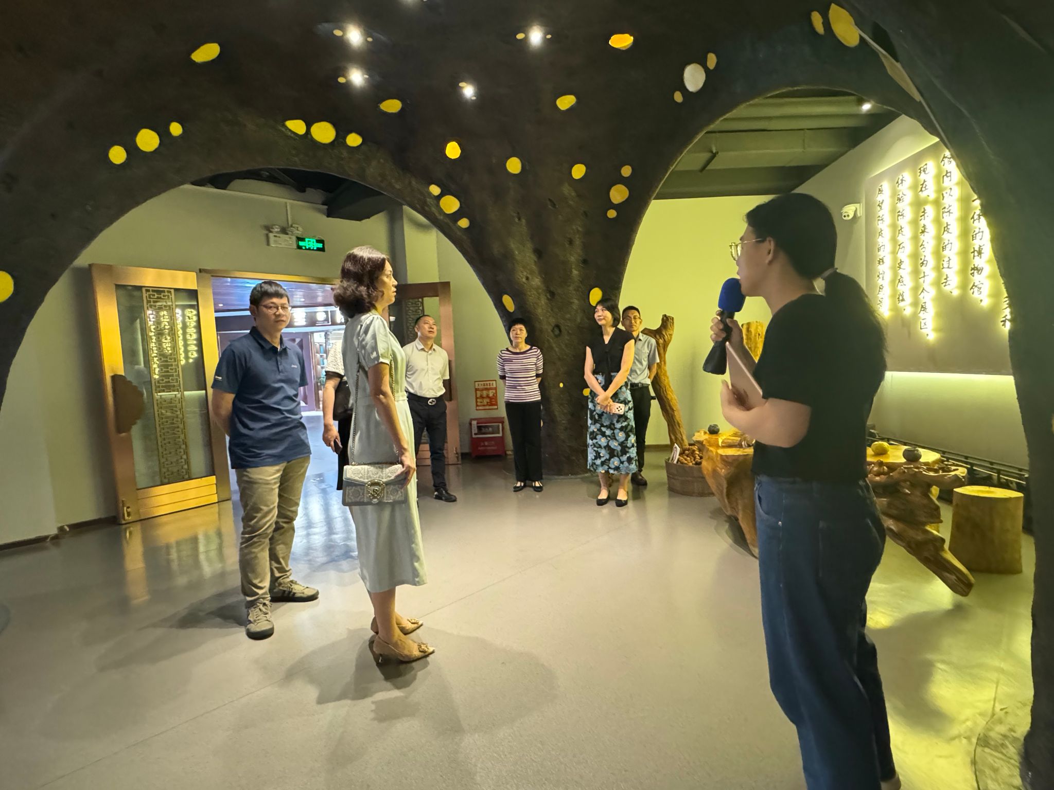 座谈结束后,唐建宁副董事长一行在新会区人社局副局长何赟的陪同下参观了丽宫陈皮博物馆,深入了解新会陈皮工艺的悠久历史、独特文化以及产业发展现状,感受新会作为“陈皮之乡”的深厚底蕴。随后,双方又前往非遗传承项目“葵艺”的展示地,在“葵艺”非遗传承人余惠云老师的介绍下,观赏了葵艺制作的精湛技艺,领略了新会丰厚的非物质文化遗产魅力。
